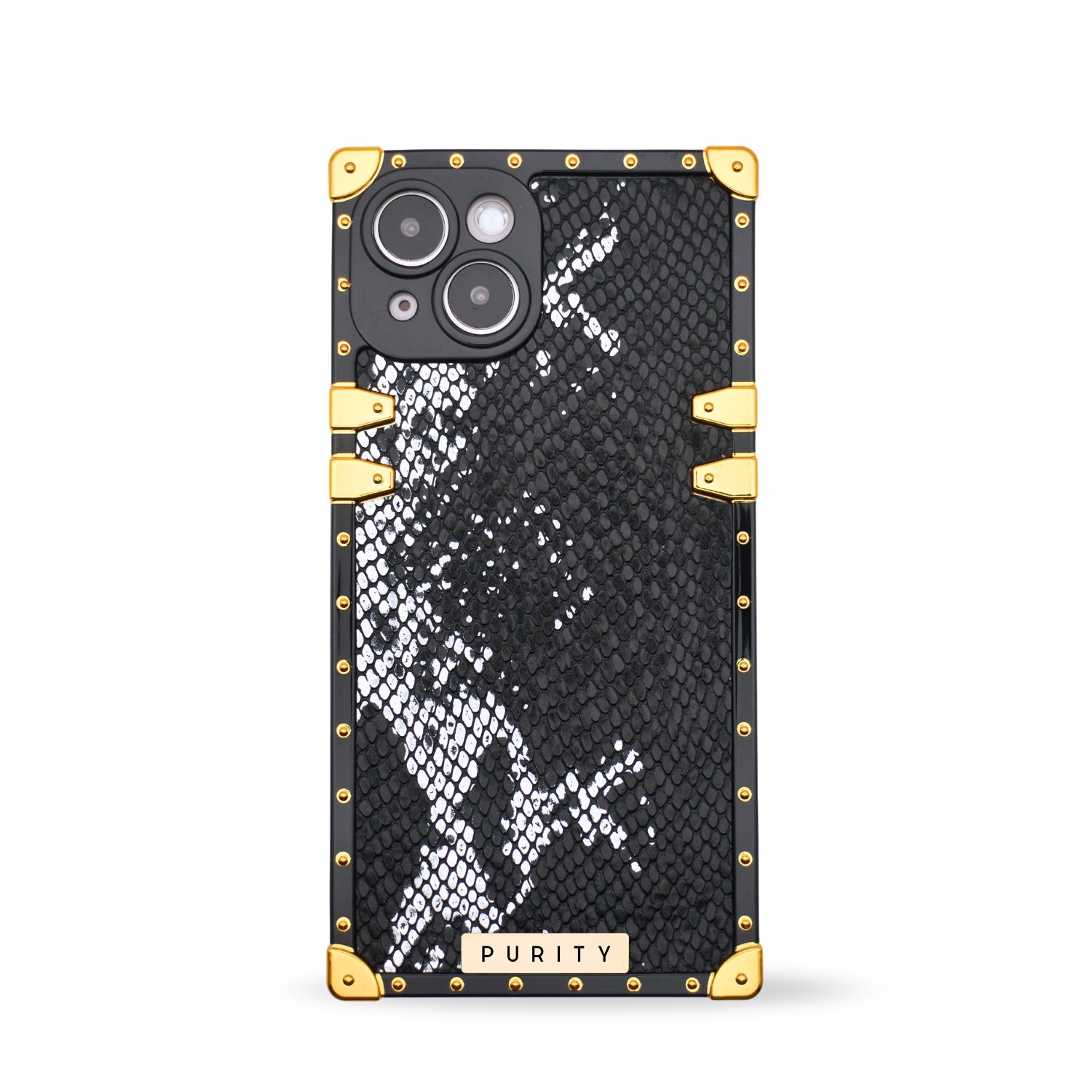 Luxury iPhone case with black snake skin pattern and gold accents by PURITY.