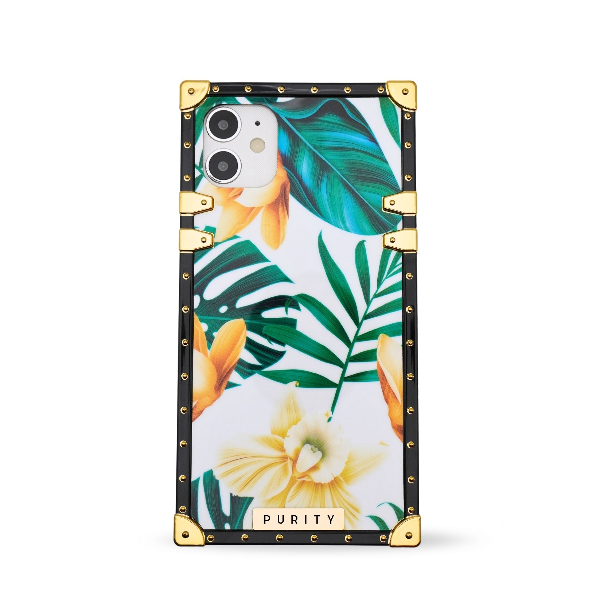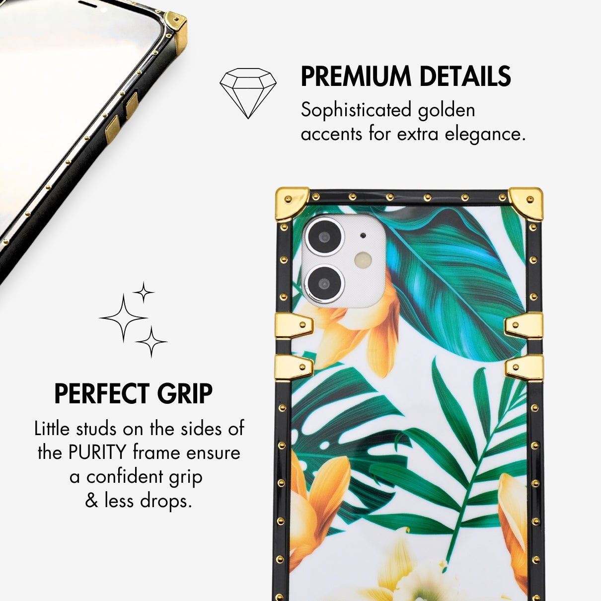 Encased in PURITY’s signature square frame, with its gold hardware and reinforced corners, this floral iPhone 13 Pro Max case is a true fusion of exotic beauty and refined elegance.