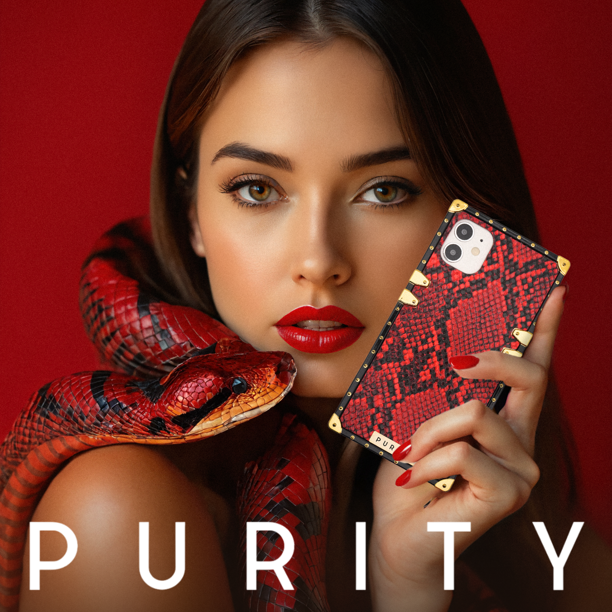 This striking iPhone 17 Air case features a fiery red and black snakeskin print, framed in PURITY’s signature square silhouette and accented in bold gold hardware.