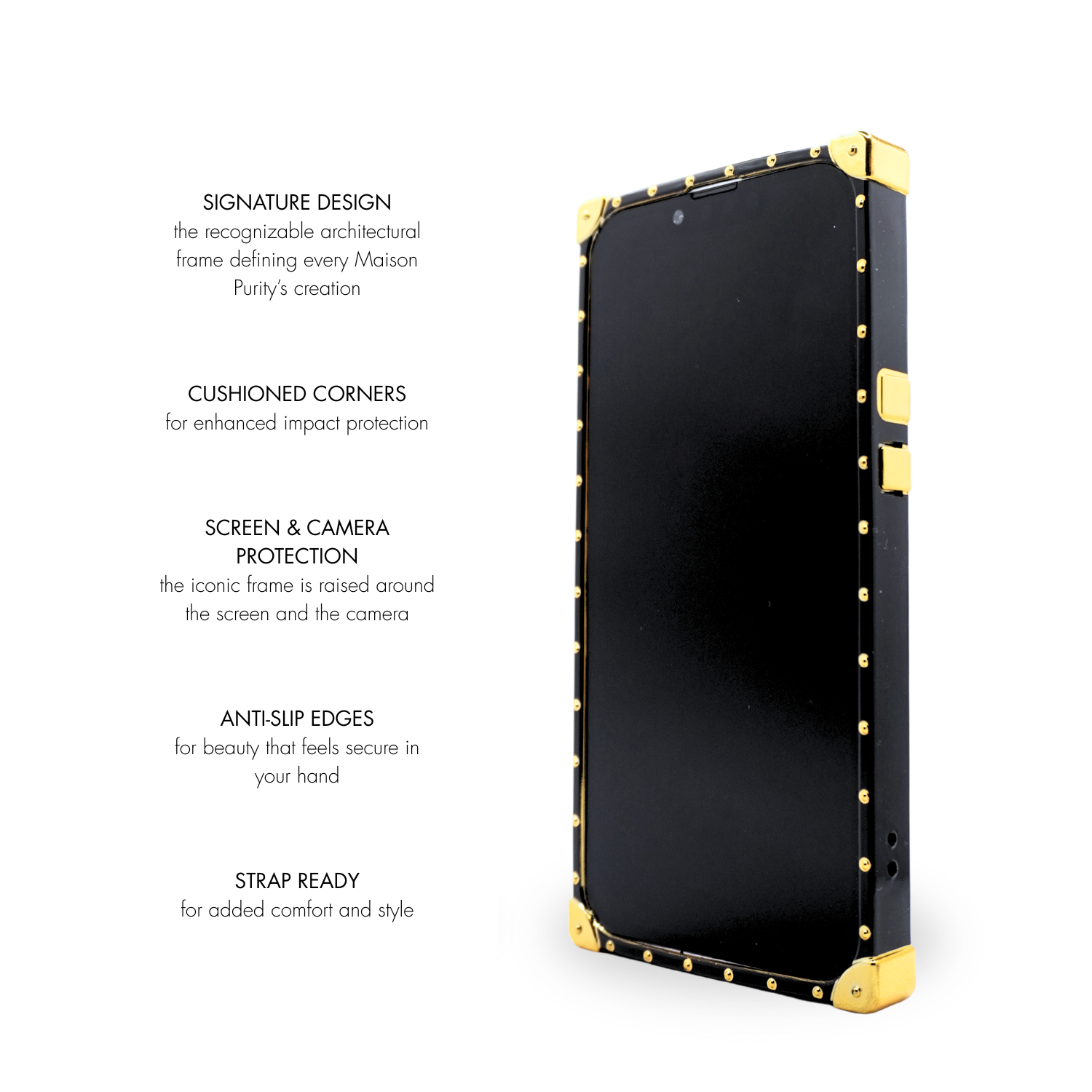 Framed by Maison Purity’s iconic black structure and elevated with golden detailing, the design balances protection and poise. A refined companion, capturing the modern elegance of a star in motion.